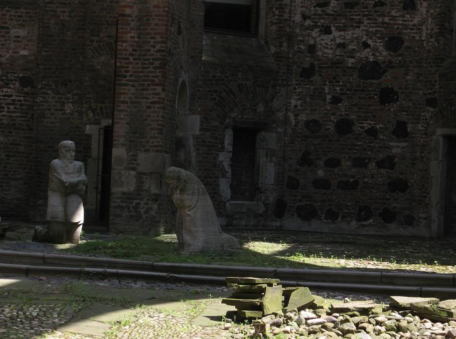 Четверо немецких старичков – два потрёпанных жизнью мужичка и две старушки стояли поблизости, и я отправился к ним, чтобы разузнать, что это за здание и почему именно оно оставленo в качестве напоминания о войне. Мне объяснили, что здесь была церковь. Во время бомбёжки 1945 года в неё попала бомба, убив всех молившихся. Тут они переглянулись и спросили, откуда я. Я сказал, что из Калифорнии. «Это были не ваши самолёты, – с облегчением засуетились божьи одуванчики, – это англичане! Видите, внутри там стоят две коленопреклонё нные статуи? Одна женщина, у которой в этой церкви погибли сын и дочь, собрала деньги на эти статуи, в память о погибших...»