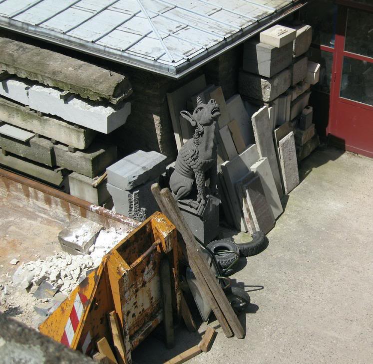Страдают и бедняги-горгули. Я подсмотрел, как один из них воет во дворике среди стройматериало в, глядя вверх на Собор, откуда его сняли – и теперь неминуемо убьют, заменив бездушным, но неразрушаемым пластмассовым двойником...