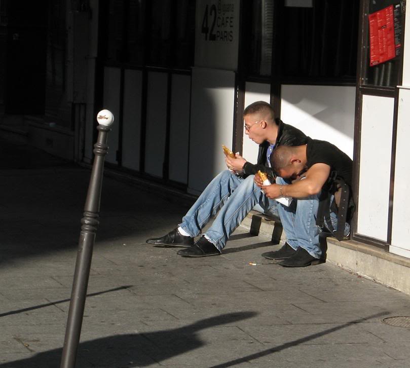 Внизу под окнами нашего дома расположены несколько кафе. Здесь всегда людно: собирается в основном молодёжь – приходят людей посмотреть и себя показать. Сидение парижан в кафе – особая тема. Оно в корне отличается от сидения в кафешках, скажем, Праги, Берлина или Рима. Там пришедшие в кафе люди беседуют, едят, пьют кофе или чего покрепче – сидя лицом друг к другу. Большинство посетителей парижских кафе сидят лицом к площади: они идут в кафе не в последнюю очередь, чтобы рассматривать идущих мимо людей. Неудивительно, что слово