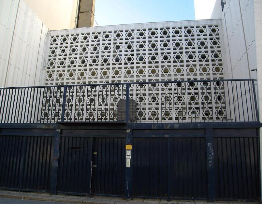 , я набрёл на дом, который сразу остановил мой взгляд. За уродливым железным забором виднелись каменные скрижали Торы, а фасад представлял собой решётку, выполненную в форме могендовидов, от которых мельтешило в глазах.