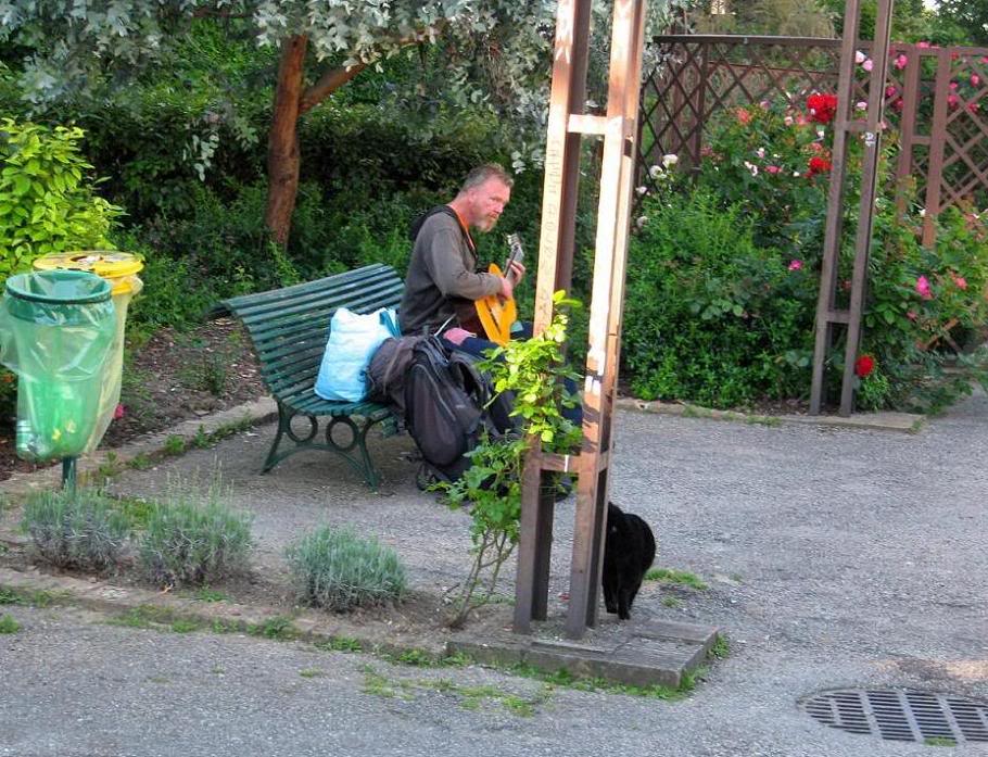 Позже в парке на берегу канала я встретил другого клошара, который уже проснулся и был погружён в настраивание гитары. Возле него в ожидании завтрака крутился здоровенный чёрный кот, но клошар не обращал внимания ни на кота, ни на меня. Рослый краснорожий мужик с рыжей бородой углублённо тренькал на струнах, время от времени подкручивая колки. Я приготовил камеру для видеозаписи и обратился к нему на очень дурном французском: «Сыграйте что-нибудь, пожалуйста, месье». Клошар поднял на меня глаза и выдохнул с тяжёлым техасским акцентом: «Man, ah don’t know to play, ah’m just learnin’». Кот мотнул хвостом и ушёл сам добывать завтрак...