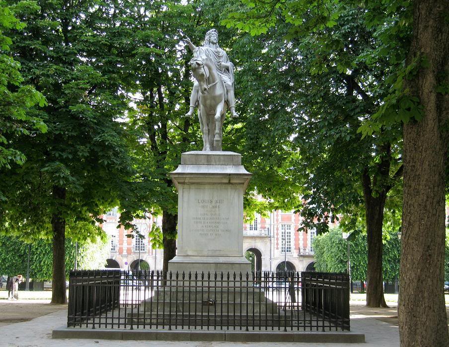 Внутри этого каре располагаются парк и площадь для парадов и празднеств. Площадь была избранным местом для дуэлей, несмотря на строжайший запрет Кардинала де Ришелье. В центре парка хитрый кардинал поставил конную статую Людовику 13-го «Справедливому» – прижизненный дар любимому монарху. Полтора века спустя по приказу Робеспьера бронзовую статую переплавят на на пушки, предназначенны