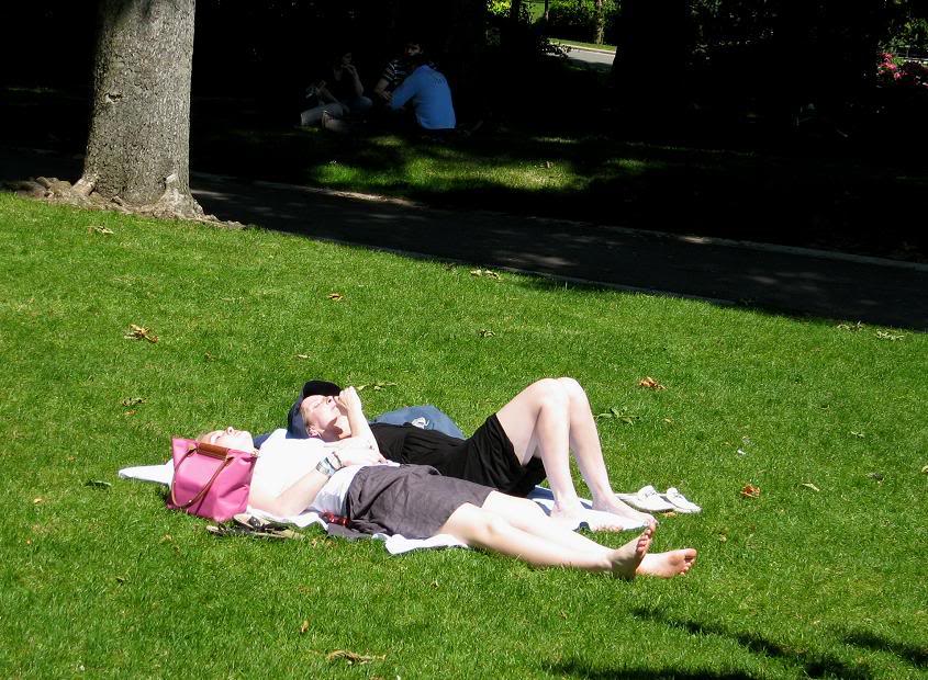 Слева и справа от фонтанов разбросаны тела парижан, ловящих тепло весеннего солнышка. Некоторые из тел вполне ничего себе.