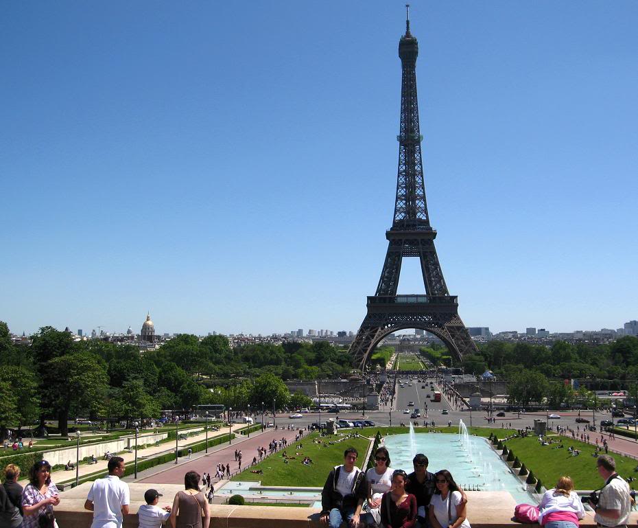 Вид на фонтаны и Эйфелеву башню, открывающийся с площадки, расположенной у