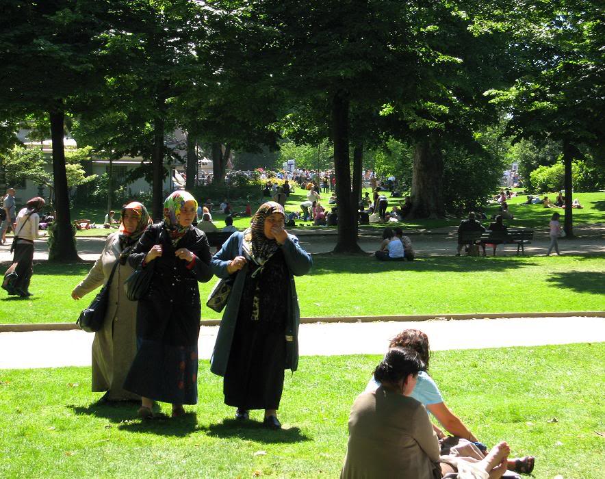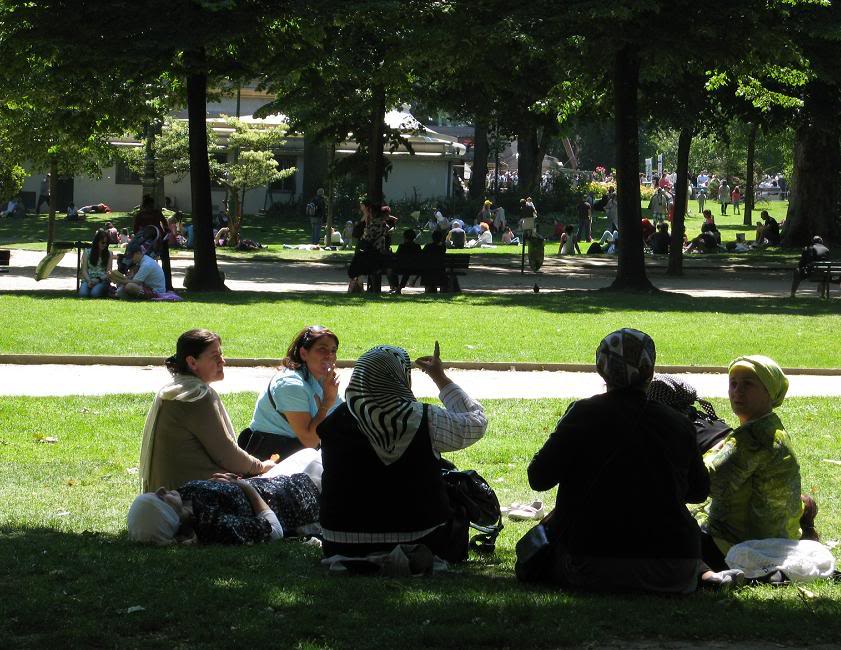 , если вам угодно). Их много. Завёрнутые в платки и длинные, до земли кафтаны, или в цивильной одежде, они собираются сюда погулять, посидеть на травке, спеть замечательно одухотворённые арабские мелодии – под бубны и без оных. Их очень много...