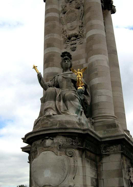 Позолоченные бронзовые статуи, во множестве украшающие мост, – работа многих скульпторов. Они выражают – на правом берегу – «Славу Наук», «Славу Искусств», «Современную Францию» и «Францию Шарлеманя», на левом берегу – «Славу Коммерции», «Славу Промышленности», «Францию Ренессанса» и «Францию Людовика XIV»