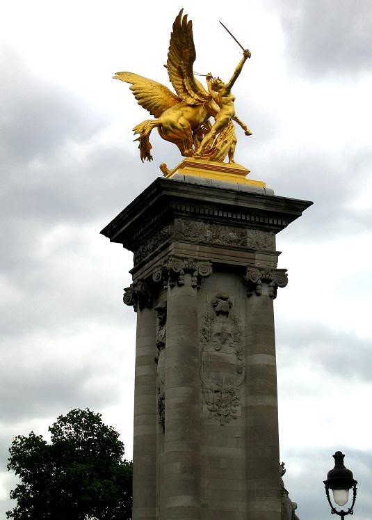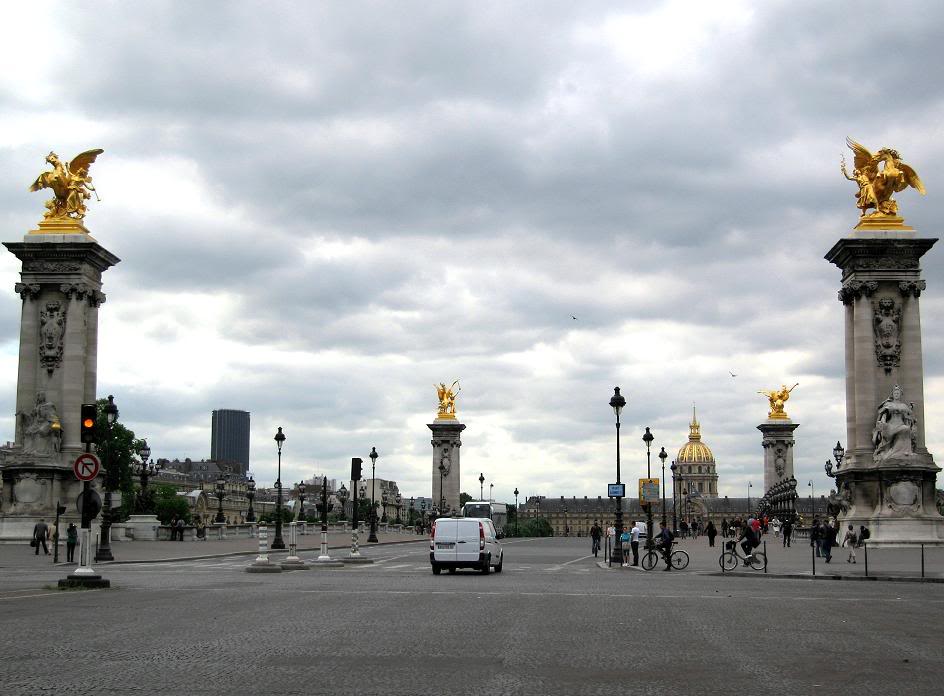 Ещё дальше – Сена, арочный мост Александра Третьего, серые пилоны которого увенчаны золочёными фигурами Славы, вдали за рекой подымается сверкающий золотом купол