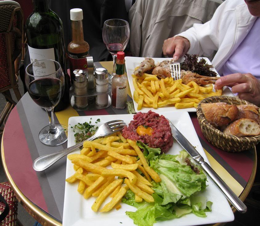 Не нужно быть ясновидцем, чтобы предсказать, что произошло дальше. Тоня набрала вилкой пару унций Тартара, пожевала в задумчивости, потом быстро запила вином и сказала, что она, пожалуй, не возражает против цыплёнка. Мы обменялись тарелками, я набрал на вилку Тартара и закинул его в рот... Всё правильно. Сырой мясной фарш имел вкус сырого мясного фарша. Попытки изменить реальность с помощью значительных количеств соли, перца и соуса оказались тщетными. И сырое голубиное яйцо, надо вам сказать, тоже приличная гадость. С другой стороны, картошка и листик салата оказались вполне съедобными. Может быть, несправедливо негативно отзываться о непривычных вкусах, и вообще, Франция – замечательное место, а наш пёс Бенька наверняка отдал бы душу за порцию Тартара, но всё равно, мне вдруг очень захотелось домой, в
