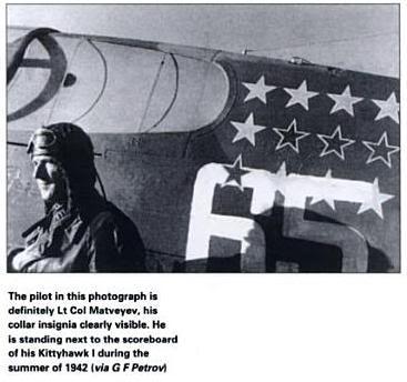 Только сравнительно недавно некоторые из пост-советских историков нехотя начали признавать, что русские пилоты летали на ленд-лизовских самолётах, и летали весьма успешно. Напомню, к примеру, трижды Героя Советского Союза Александра Покрышкина, пилотировавшег о P-39 Airacobra. На этом же самолёте летал дважды Герой Советского Союза Дмитрий Глинка. Дважды герой Ворожейкин летал на истребителе Kittihawk. Вот ещё один асс – подполковник Матвеев, запечатлённый рядом со своим Kittihawk-ом в 1942 году в Плеханово: