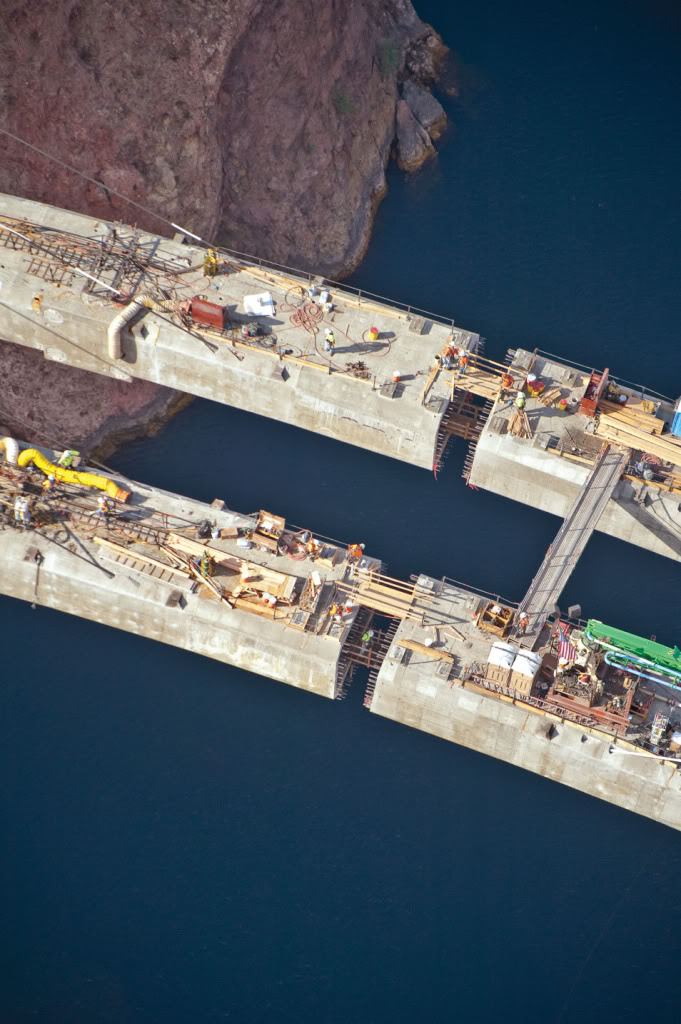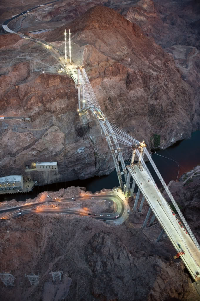 По этому мосту, на высоте 900 футов над рекой Колорадо, пройдёт новая секция фривэя US Route 93, соединяющего Неваду и Аризону, - в обход перегруженной старой дороги, кусок которой можно видеть на снимках - он извивается вдоль гребня плотины и уходит за красные скалы на южном берегу Колорадо.