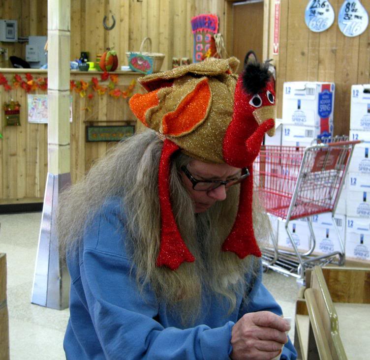Потом - в деревенскую лавку. Там продавцы и продавщицы уже нарядились индюшками ко Дню Благодарения. Тыква тоже является частью праздничного застолья.