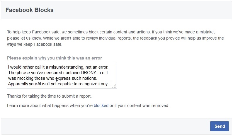 Ясно дело, это было вопиющее нарушение "community standards" – поскольку общеизвестно, что в их community антисемитизм вообще не существует!