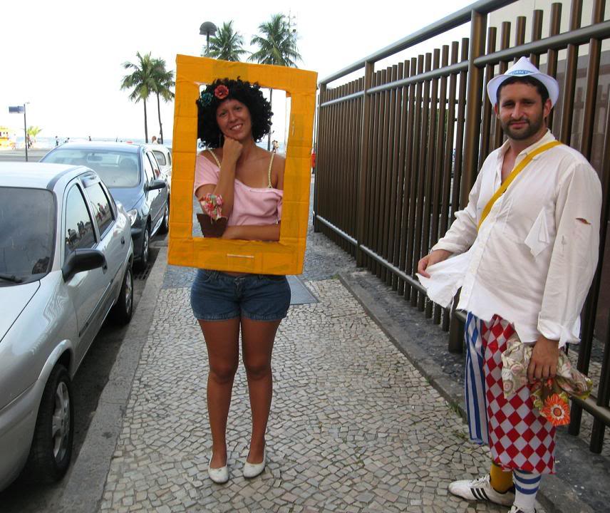 Люди наряжаются для карнавала самым невообразимым образом. Многим не по карману покупать костюмы фабричного изготовления, и они сами создают свой образ. Эта изобретательна я женщина решила изображать свой собственный портрет. Мужчина горд предоставленно й его спутнице возможности позировать перед объективом.