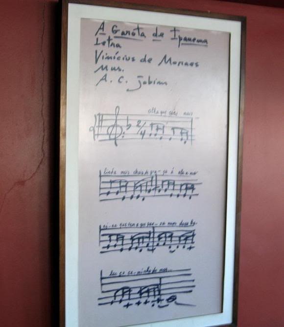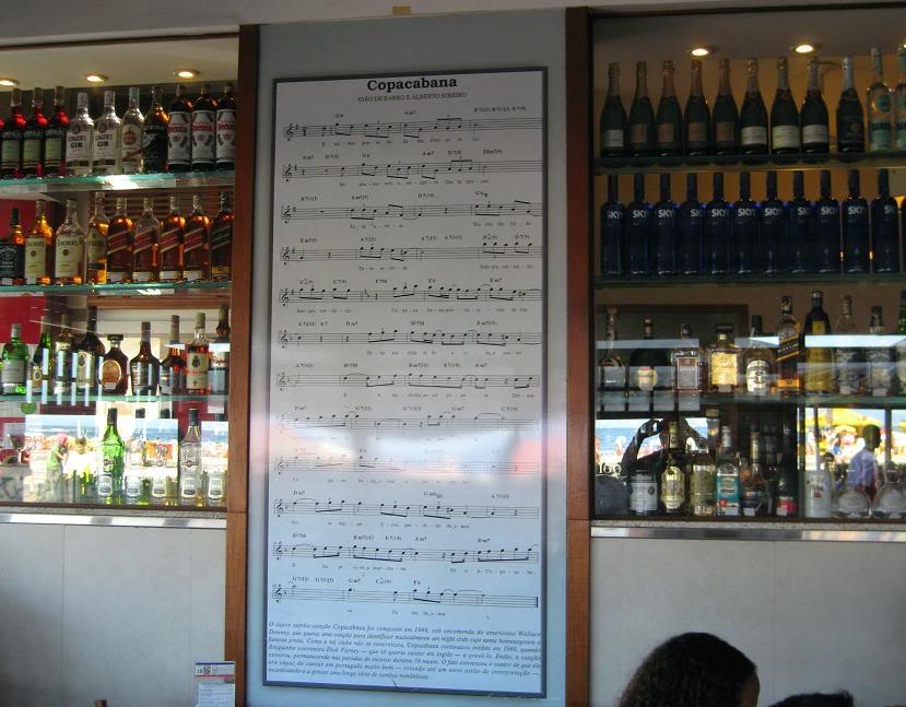 (Девушка из Копакабаны). Согласно легенде, распространяем ой владельцем кафе, оно построено в точности на месте старого кафе, где собирались в давние времена Жоао Жильберто и Том Жобим с друзьями. Поэтому на стенах висят ноты ставших всемирно известными хитов босановы.