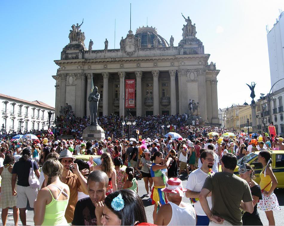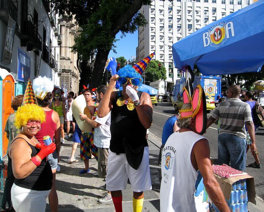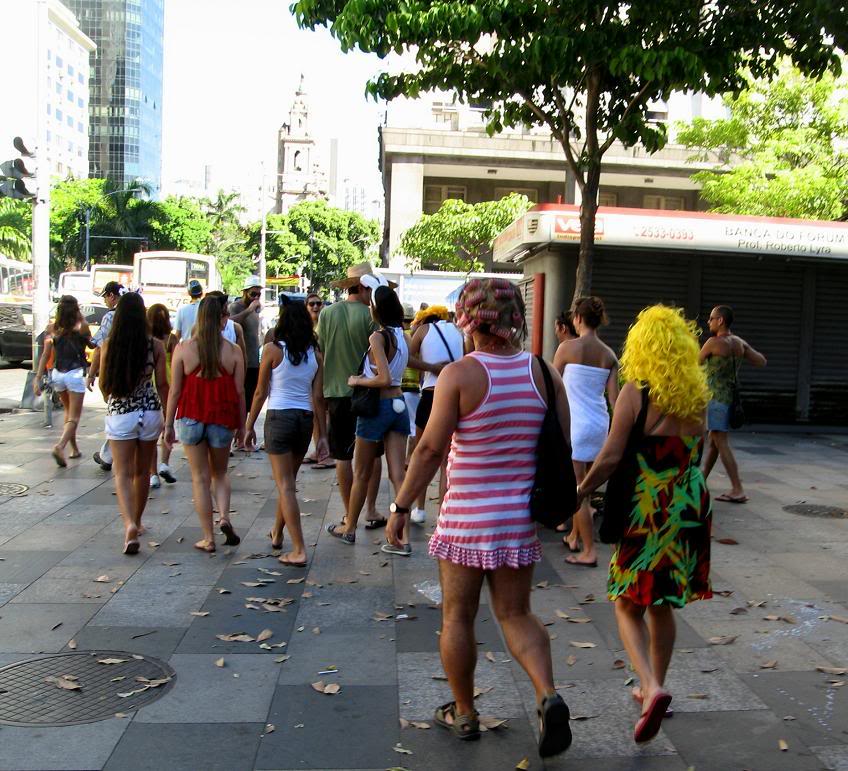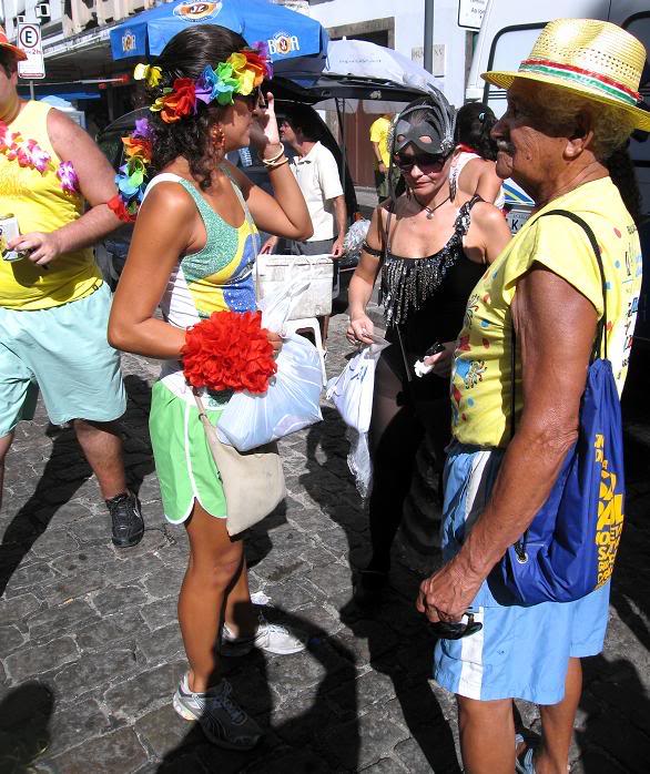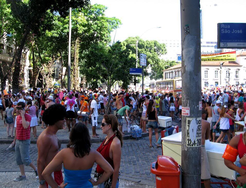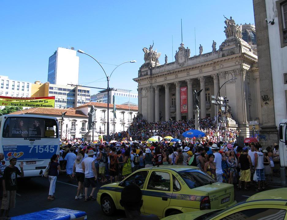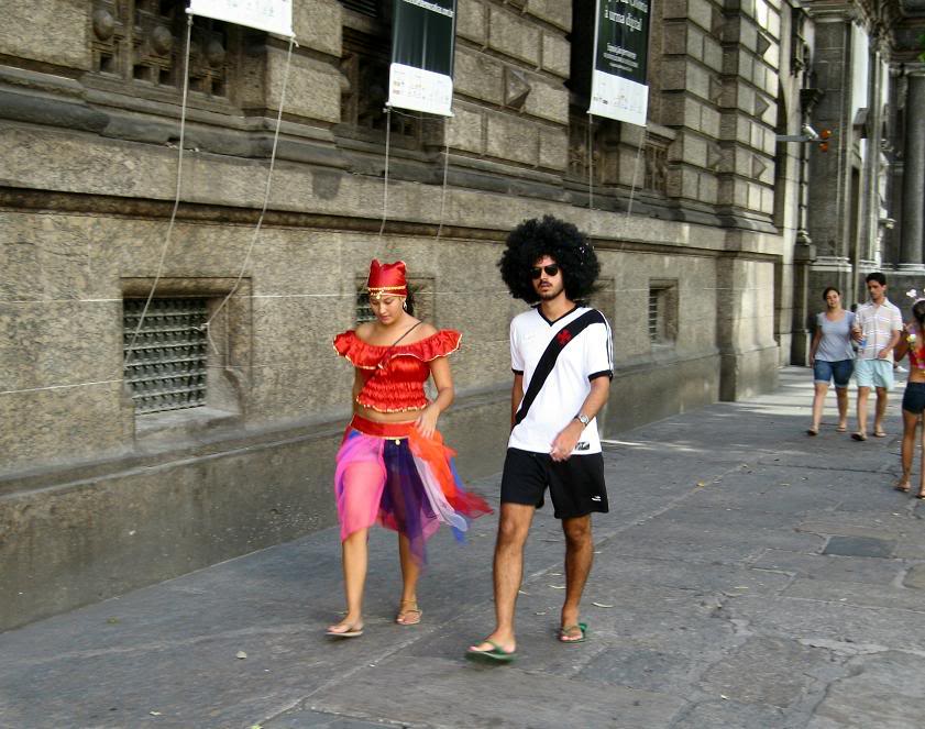 Шум стоял совершенно очумительный. Одновременно играли два оркестра, устроившиеся на ступеньках. Каждый из оркестров наяривал собственную самбу. Для полноты картины представьте ещё плывущие над этой тусовкой ароматы пива, жареного мяса и даров моря (в прилегающих к площади переулках во-всю работали грилы). Водители автобусов и такси выгружали здесь всех пассажиров, осознав невозможность пробиться сквозь толпы ряжёных.