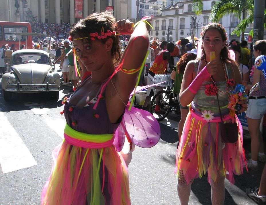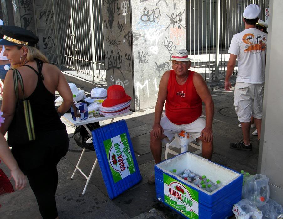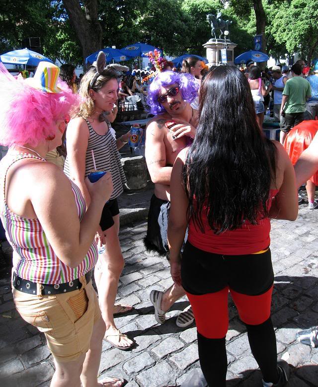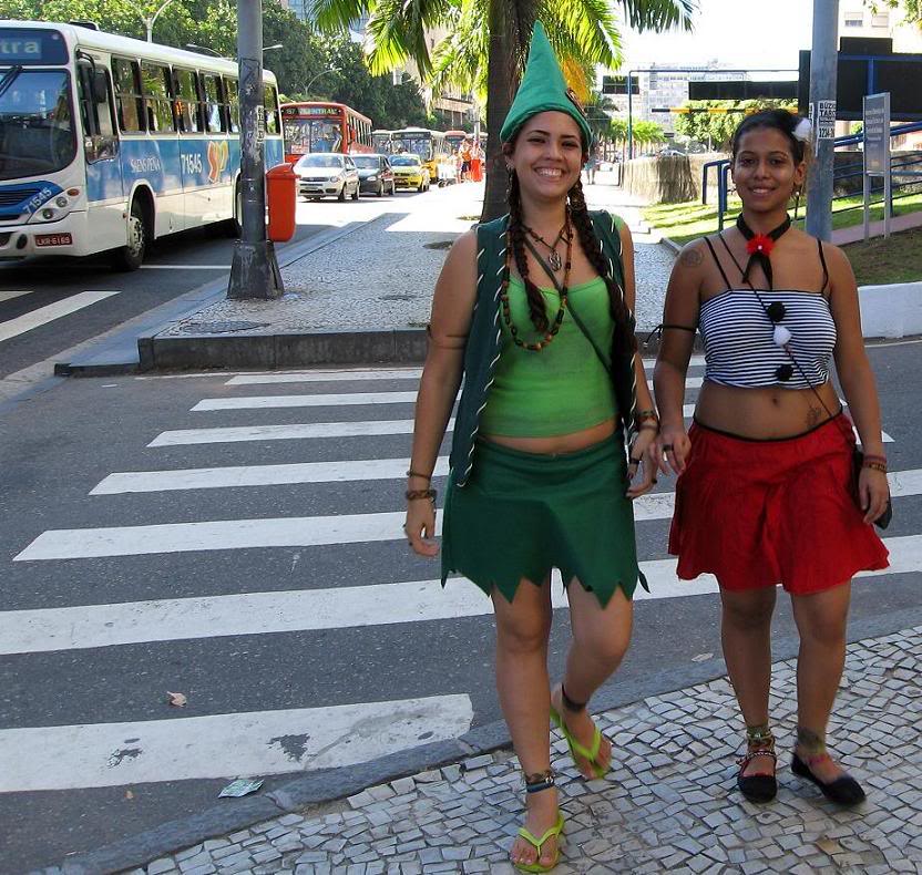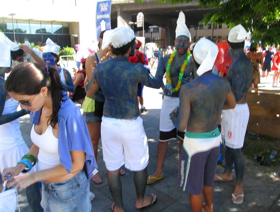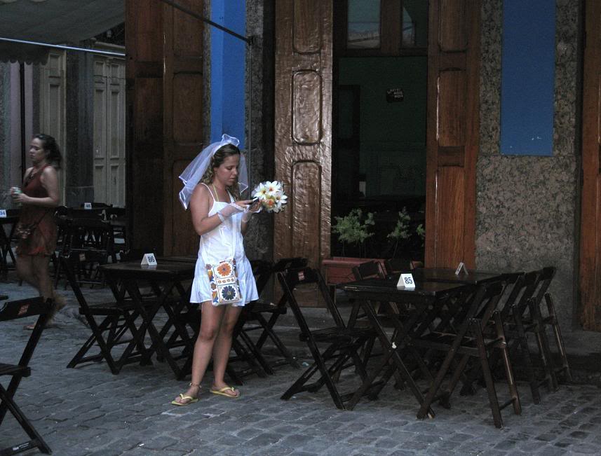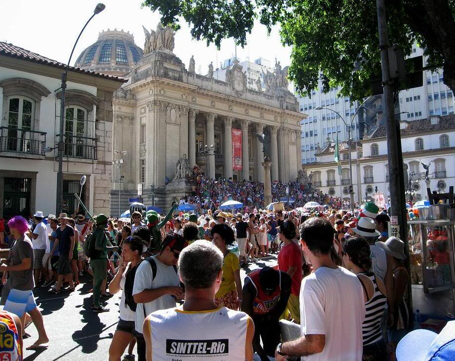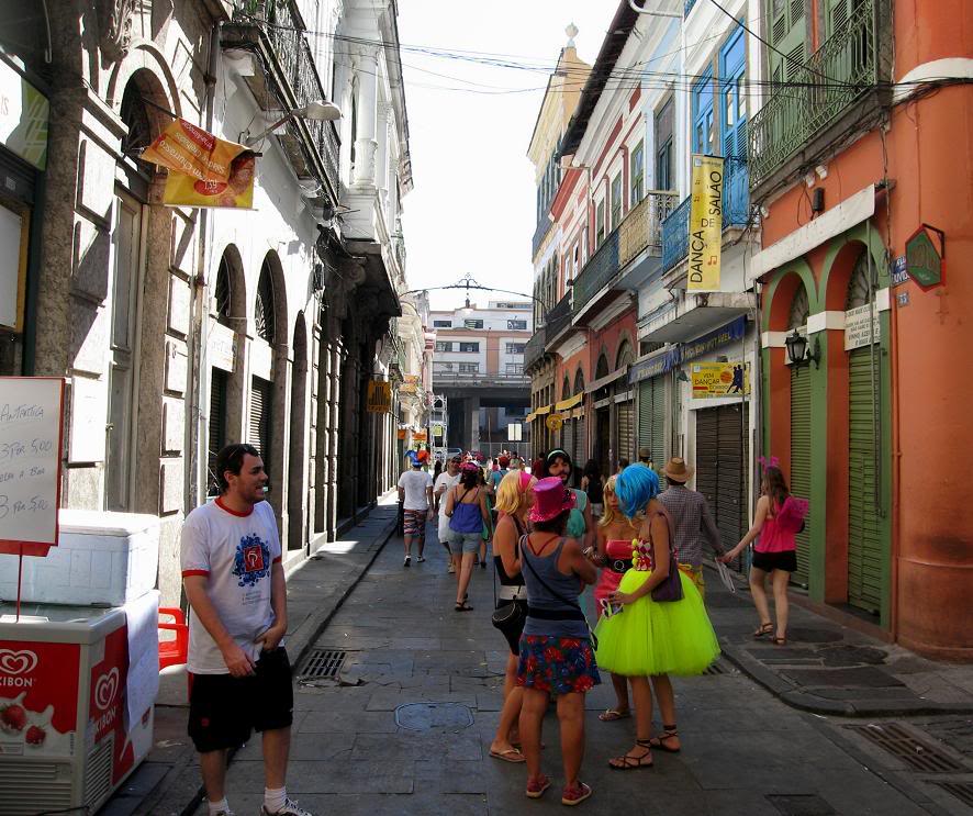 Шум стоял совершенно очумительный. Одновременно играли два оркестра, устроившиеся на ступеньках. Каждый из оркестров наяривал собственную самбу. Для полноты картины представьте ещё плывущие над этой тусовкой ароматы пива, жареного мяса и даров моря (в прилегающих к площади переулках во-всю работали грилы). Водители автобусов и такси выгружали здесь всех пассажиров, осознав невозможность пробиться сквозь толпы ряжёных.