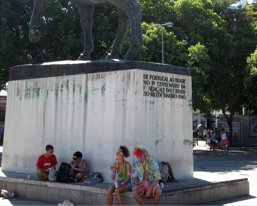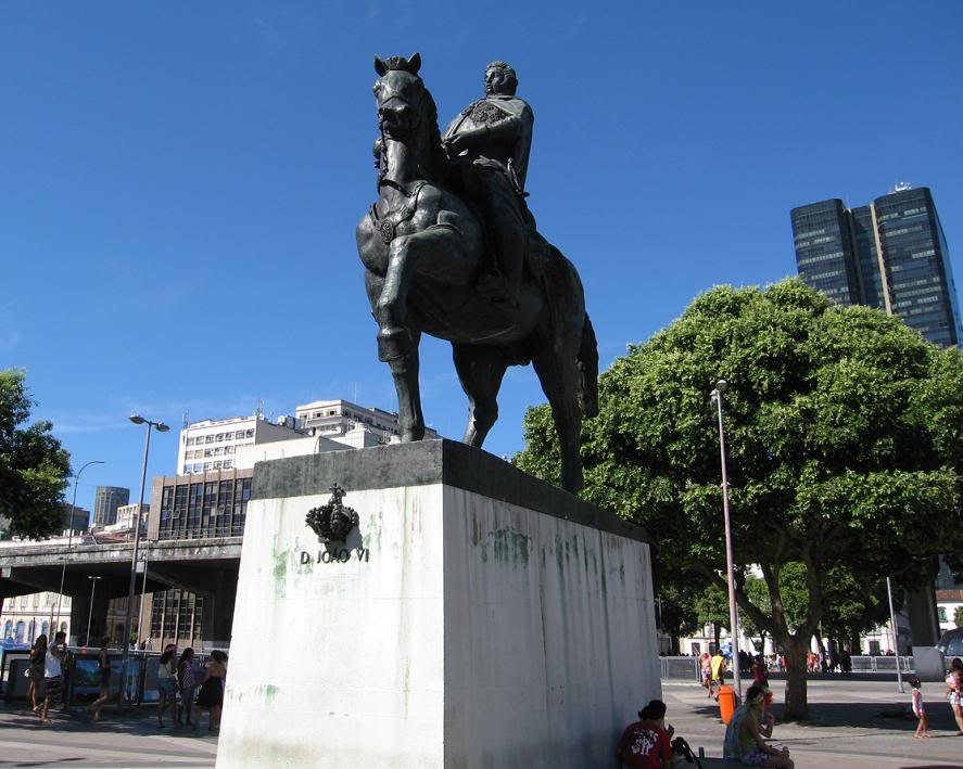 Зато к востоку от Paço Imperial, за фривеем, на набережной было тихо и малолюдно. Там мы с Тоней разыскали памятник королю Жоао Шестому, отлитый в бронзе, как и полагается Отцу Отечества. Жоао сидит на породистом мускулистом коне с яйцами, и благодарные потомки в костюмах с птичьими перьями отдыхают в тени любимого монарха.