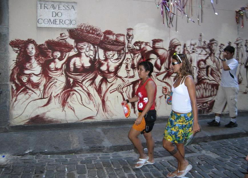 На стене за аркой – то ли фреска, то ли графитти – бразильские женщины предлагают свои товары входящему