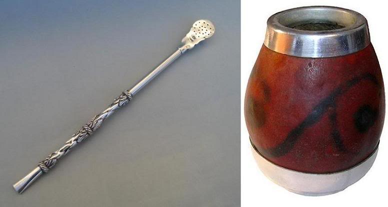 Но есть национальные особенности, и на них стоит остановиться отдельно. К примеру – привычка везде и всегда пить mate. Матэ – ненаркотически й и безалкогольный настой травки, называемой yerba mate (chimarrão). Yerba mate дословно означает «трава для матэ». Она продаётся повсюду в супермаркетах. В травке содержится кафеин, но не в бóльших количествах, чем в чае. Процедура распития матэ состоит в том, чтобы на две трети заполнить специальный небольшой сосуд yerba mate и залить очень горячей водой (ни в коем случае не кипятком – кипящая вода якобы убивает витамины и портит вкус... xотя, сказать по правде, вкус матэ показался мне настолько непригодным для питья, что представить не могу, как его можно было бы испортить). Пить мате прямо из сосуда невозможно – вся трава окажется во рту. Поэтому комплект включает специальную трубочку с узкими дырочками – фильтр, через который нужно по-гурмански медленно посасывать серо-зеленоватый настой. Фильтр, называемый bombilla., обычно изготовляют из сплава alpaca (nickel silver). Но есть и дорогие фильтры из настоящего серебра. Сосуды делают, выдалбливая сердцевину плода дерева calabash, и часто украшают чеканкой из того же сплава или серебром и инкрустациями (туристский вариант).