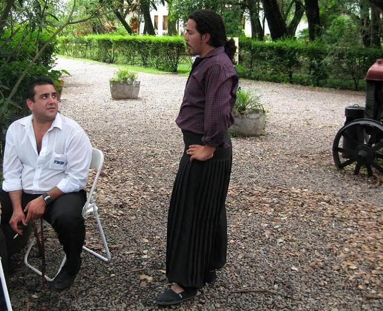 Культурная традиция требует, чтобы гаучо носил небрежно повязанный на шее платок, берет или широкополую шляпу, холщовую рубаху, жилет или длиннополый чёрный кафтан (эти кафтаны могли бы заслужить одобрительные взгляды в хасидской синагоге), шаровары «bombachas», поддерживаемые кожаным поясом с вычурно-чеканной серебряной пряжкой, и чтобы сзади за пояс был засунут здоровенный инкрустированн ый серебром нож. В малый джентльменский набор входят также большие кожаные сапоги на высоком каблуке или остроконечные туфли на мягкой кожаной подошве.