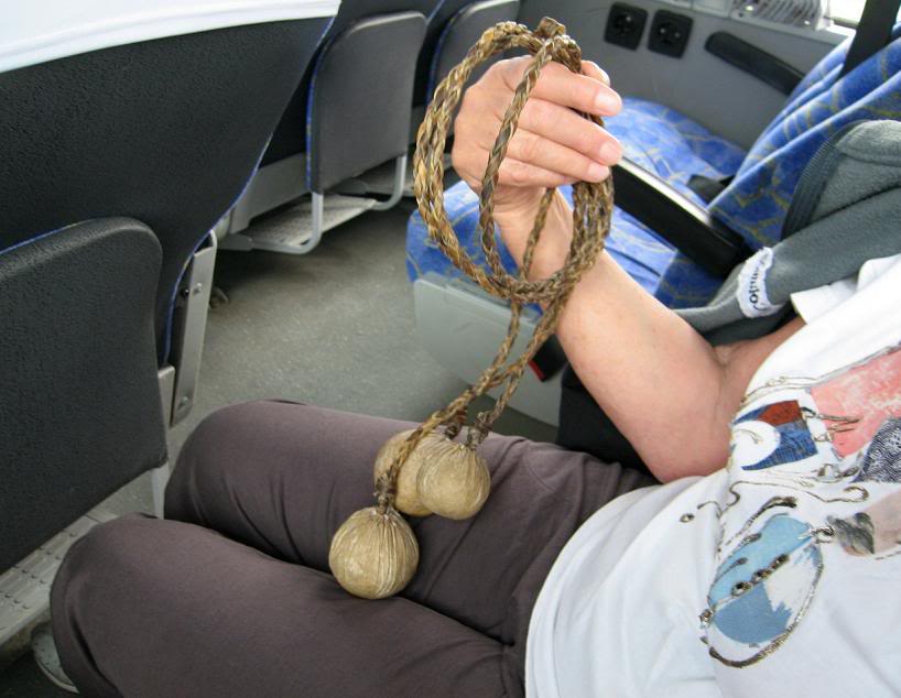 Я сперва расстроился, что мы так глупо клюнули на элементарную приманку для гринго, но девица-гид резонно возразила – не стоит мол грустить по этому поводу: пирушка с танцами и соревнование гаучос будут настоящими, а скот и подавно без всяких подделок! Что поделаешь, я купил себе в лавке отлично выделанный кожаный пояс и успокоился. Сыну мы купили calabash с фильтром для матэ и пакет «заварки». А Тоня сказала, что хочет, чтобы я подарил ей boleadoras. Я поинтересовалс я, что она собирается с ними делать. «Метать в тебя, когда ты в следующий раз решишь отправиться по своим девицам». Кто мог бы отказать любимой жене в такой малости? На фото ниже: Тоня внимательно рассматривает приобретенное для улучшения семейной жизни оружие