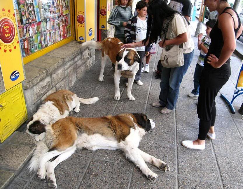Ну и, ясное дело, раз уж в городе швейцарцы, на тротуарах полно сенбернаров, таких же ленивых, как строительные рабочие. Хозяйки заскочили «на минутку» в шоколадную лавку, оставив своих псов восхищённым туристам...