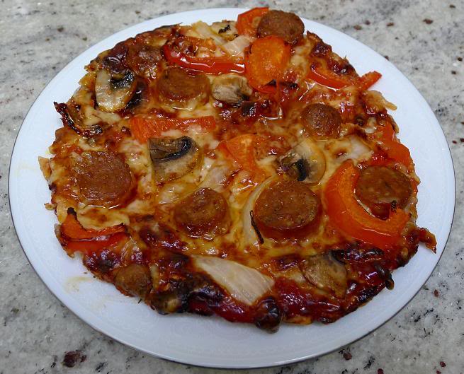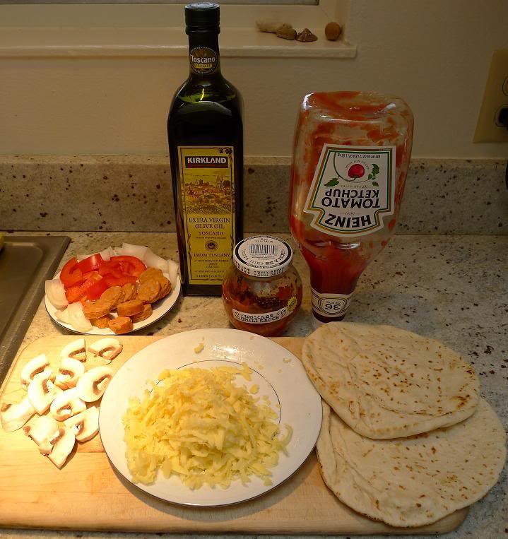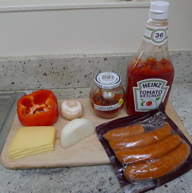 В холодильнике нашёлся сыр (к сожалению, моццареллы не было, пришлось использовать Vermont cheddar). В качестве ударного компонента пригодился пакет Italian spicy sausages. Из овощей - сладкий лук, перец - red bell pepper, ну и грибы, конечно. Ketchup у меня был, но помидоров не было, и я решил восполнить пробел, добавив к ингредиентам Homade Chili Sauce.