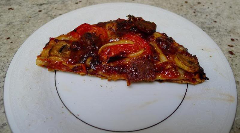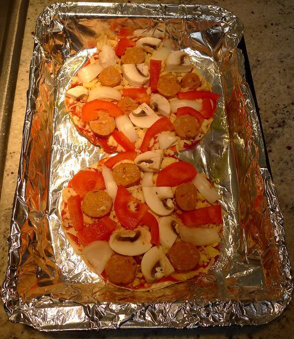 Застелил стальной поддон алюминиевой фольгой и слегка смазал фольгу оливковым маслом (Extra virgin olive oil from Toscana). Взрезав внутренние карманы питы, смазал их изнутри Homade Chili Sauce, сверху размазал кетчап, посыпал сыром, набросал поверх сыра кусочки колбасы и овощей и сунул в духовку, выставив температуру 340˚F (примерно 170˚С).