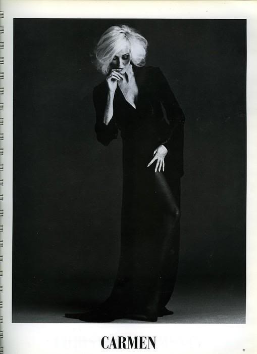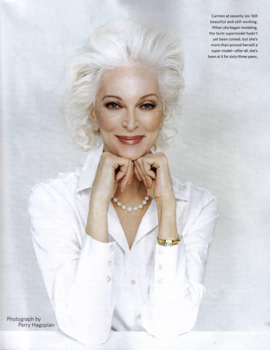 Он устроил пробную фотосессию. В то время Кармен начинала седеть, но вместо того что бы покрасить волосы, она высветлила их ещё больше, снявшись совершенно седой! Это был переворот в мире модной фотографии.