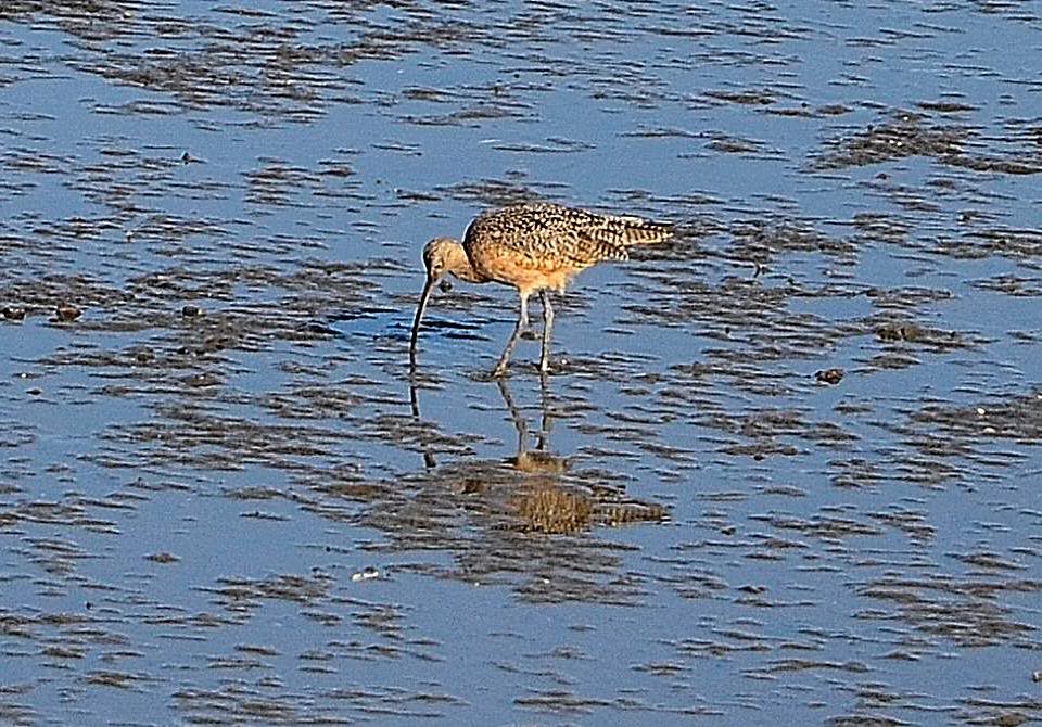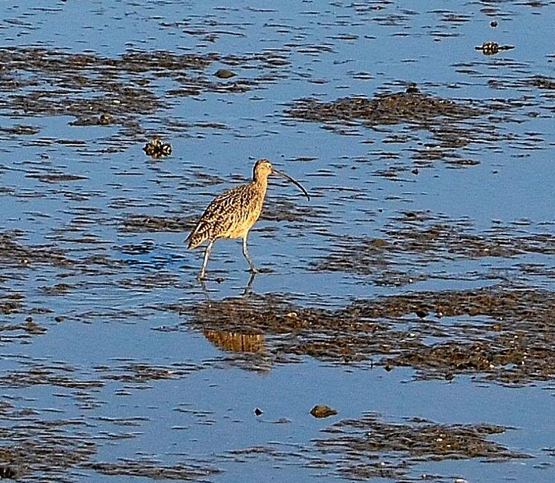 В зоне отлива бродит большой кроншнеп, вытаскивая длинным клювом прячущихся в жирной грязи креветок.