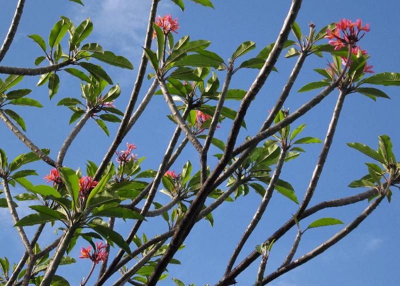 Плюмерия растёт повсюду в жаркой зоне островов – вблизи океана. Есть разновидности Plumeria c белыми и красными цветами. Цветы её имеют одуряюще сладкий запах, который для меня навсегда ассоциируется с Гавайями. Этот аромат считается (по моим наблюдениям, не напрасно) очень сильным афродизиаком. У гавайцев есть обычай плести ожерелья из цветов плюмерии. Эти ожерелья называются