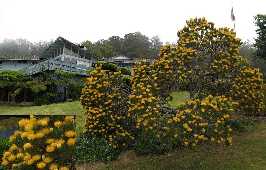 Куст “золотого сияния”. Понятия не имею, как на самом деле называется это растение. Мы встретили его возле странного модерной формы ранчо во время подъёма на вулкан Халеакала, в зоне облаков (я расскажу о вулкане отдельно). В углу снимка я поместил увеличенную деталь цветов этого растения.