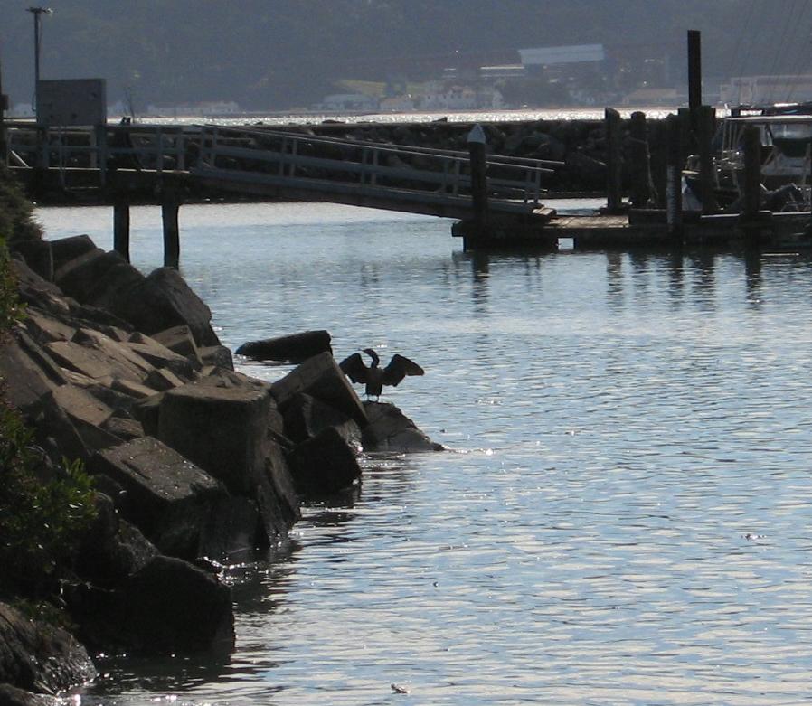 Когда мы уже усидели почти всю бутылку, на сходнях за нашей спиной появился какой-то дядечка и cтал разговаривать о том, что вон там мол есть бумажка с надписью NO OUTSIDE ALCOHOL, и разве мы не видели. Я уверенно объяснил ему, что конечно же видели, и стараемся следовать этому указанию, переливая алкоголь снаружи вовнутрь, и что мы близки к успеху. Он засмеялся, махнул рукой и ушёл в клуб. Наверное бармен. В другой раз надо будет выпить чего-нибудь у него в баре, чтоб не обижался.На камнях у берега после удачного ныряния за рыбой сушил крылья фараллонский корморан. Это разновидность баклана, их ещё называют devil bird или croq-duck; а в Оrange County я слышал название nigger goose, но Оrange County – это совсем особое место, может я ещё расскажу когда-нибудь о странностях её обитателей. Фараллонские кормораны - здоровенные чёрные птицы с размахом крыльев до 130 см. Поскольку их крылья не полностью герметизирован ы жиром, как у других водоплавающих птиц, они намокают при нырянии, и после водных процедур кормораны вынуждены разыскивать какое-нибудь подходящее место, чтобы просушить крылья на ветру и нежарком зимнем солнце. За этим занятием я его и сфотографирова л.