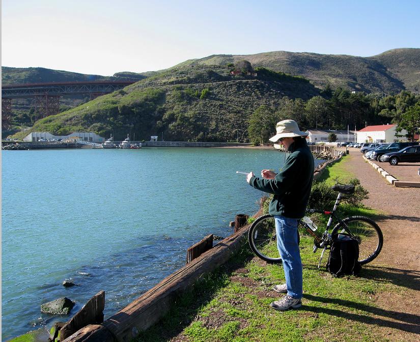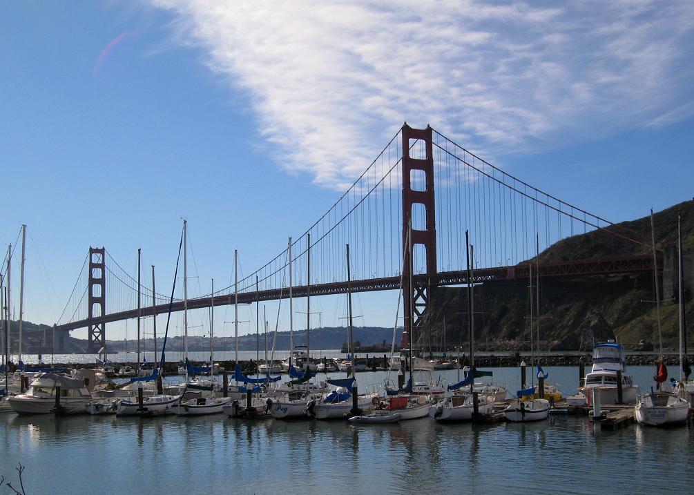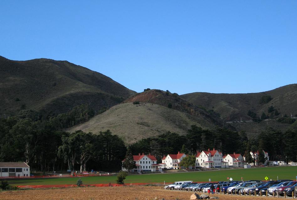 Если из Сан-Франциско ехать на север через Golden Gate Bridge и сойти со 101-го фривэя на первом выходе за мостом, можно, покрутившись, спуститься вниз к северной опоре моста. Здесь расположен старинный форт Бэйкер. Вот сюда-то мы с супругой и приехали в минувшее воскресенье - пройтись, вдохнуть океанского воздуха, ну и само собой, выпить винца в красивом месте.Как видно на картинке, фривэй идёт себе по холмам дальше в Марин, а здесь зелёная травка, яхты, белые домики бывшей военной базы и тишина, нарушаемая только криками морских птиц.