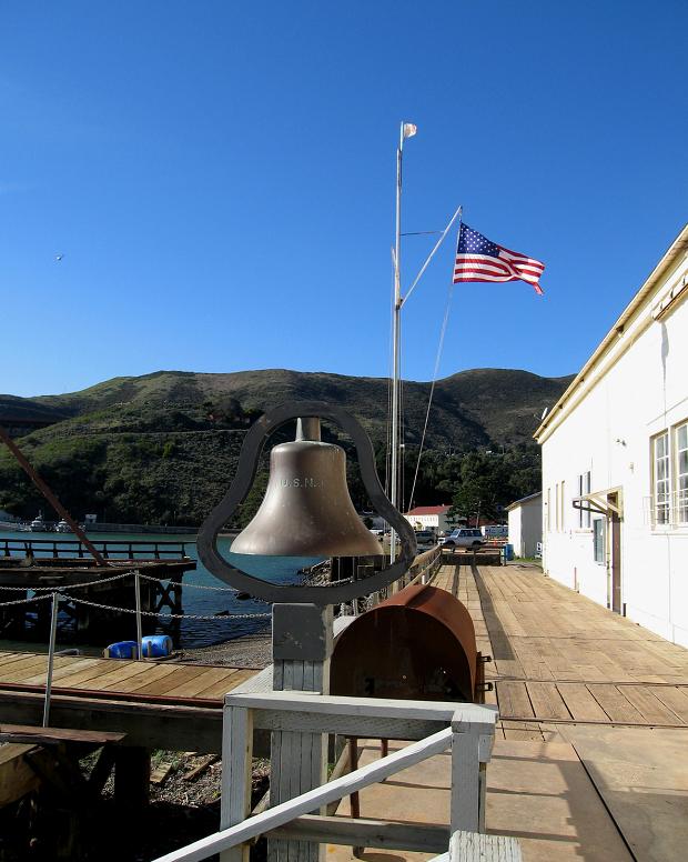 В нескольких старых зданиях форта расположен Discovery Museum, где по викендам всегда толкутся люди с детишками. Мы держались от детишек подальше, высматривая после длительной прогулки подходящее место для ланча - у нас была с собой бутылочка Castoro Cellars Syrah 2005 года (из Пасо Роблес) и два пластмассовых стаканчика. Длинный белый барак, перед которым висел старый морской колокол, привлёк наше внимание.