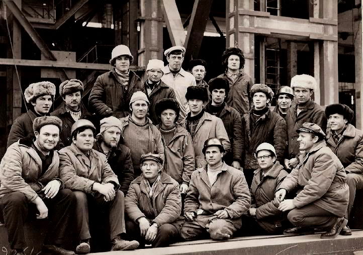 На нижнем снимке – я со своей любимой бригадой монтажников-высотников Оргэнергостроя . Прораб (его звали Володей) в кожаной кепчонке сидит в первом ряду справа, рядом со мной. Теперь я благодарен ему за науку. Хороший парень был. Раков мы ловили вместе потом. И вообще, много с этими ребятами было выпито, хорошего и разного.