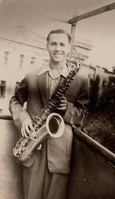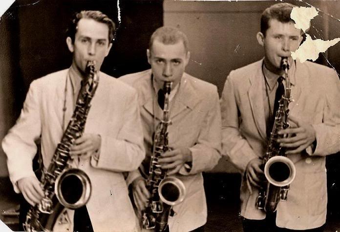 Соседи по коммуналке почему-то сильно возражали против моих попыток освоить этот восхитительный инструмент, символ буржуазно-заграничного разложения. Поэтому приходилось тренироваться на балконе, а позже – сидя на коньке крыши нашего дома. На снимке ниже – саксофоновая группа знаменитого тогда в среде киевской молодёжи джаз-оркестра Киевского Инженерно-Строительного Института: Толик по прозвищу "Пачача" c cакс-тенором, я c альтушкой и Вадик Дынер тоже с альтушкой. Я пострижен "под ноль" после очередной неприятности с милицией.