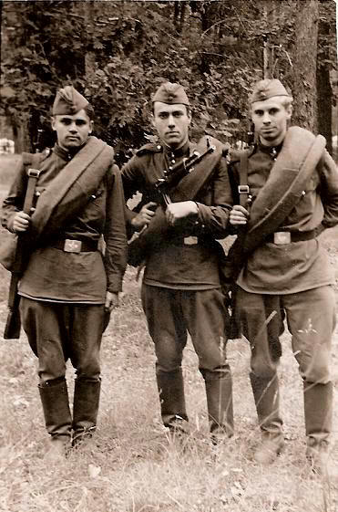А вот это я сам (в центре) с двумя корешами, в ненавистной униформе – стараюсь сделать самое зверское лицо, на какое только способен, поскольку фотография призвана была выражать империализм рабочих, крестьян и примкнувшей к ним интеллигентско й прослойки по отношению к народам остального мира. Заметьте, насколько моя скатка правильнее скатана, чем у двух других разгильдяев.