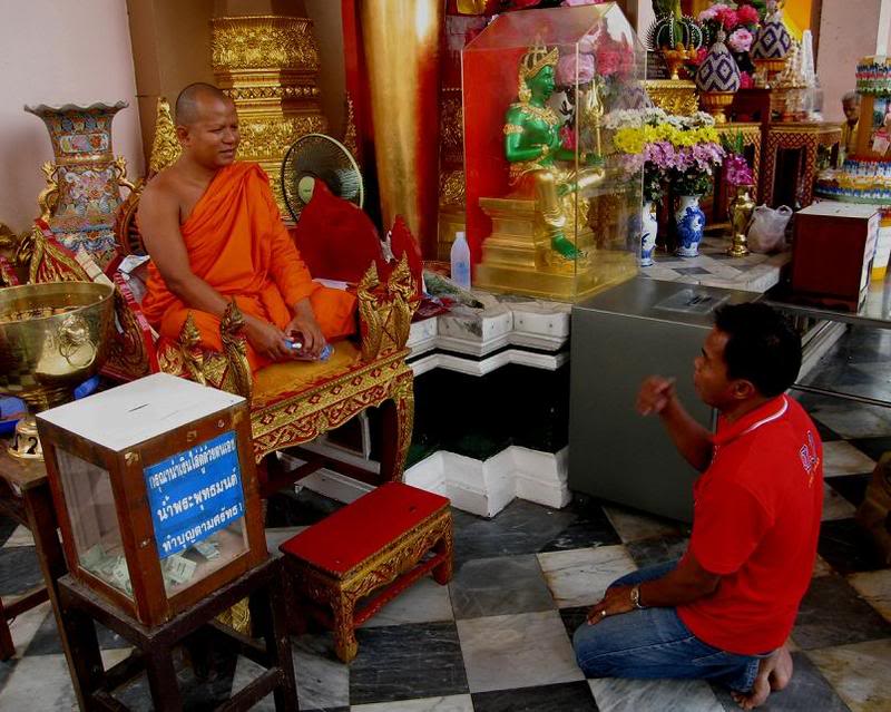 Превосходство монахов перед обычным человеком очевидно. Как рассказывал гид в одном из храмов, таиландский язык имеет специальный словарь выражений, который принято использовать, говоря о монахах даже в третьем лице. При посещении храмов (которые, кстати, используются не только для вознесения молитв, но служат местами, где можно вести беседы, обсуждать разнообразные семейные вопросы, есть, пить, отдыхать и общаться с монахами) поражает строго соблюдаемая субординация отношений между секулярной публики и монахами: обычные люди едят после того, как поели монахи, следуют позади монахов, и сидят на уровень ниже того, где сидят монахи.