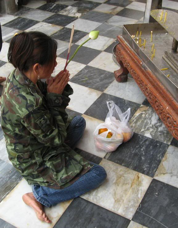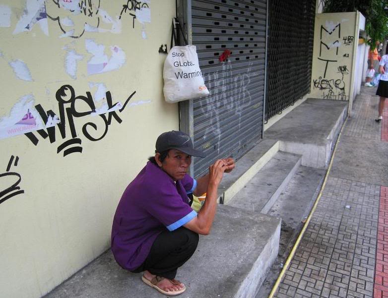 И в заключение этой части – самая, на мой взгляд, лучшая из всех сделанных мной в этом путешествии фотографий, под названием "STOP GLOBAL WARMING": нищий, сидящий под стеной дома на улице Бангкока; над ним висит его пластмассовая котомка, на которой написано "Остановить Потепление Планеты!"