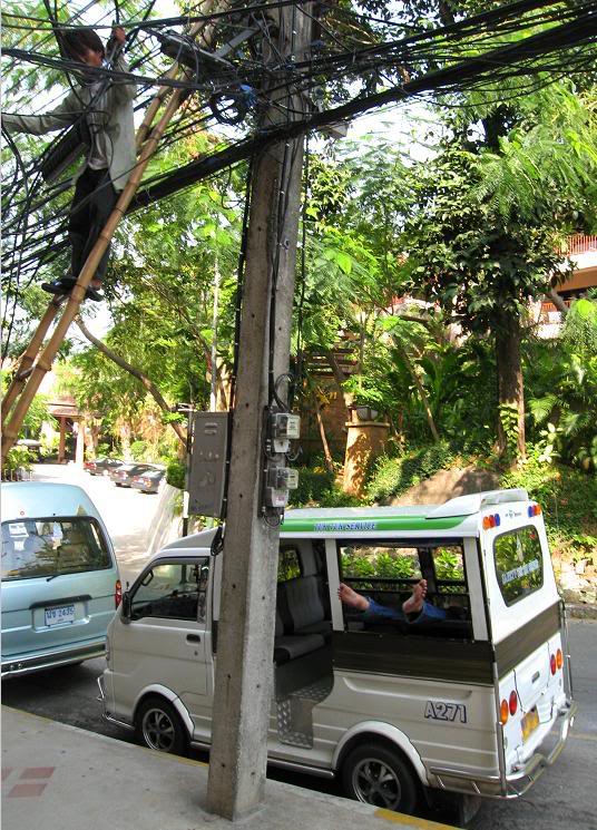 На снимке внизу показан человек, выполняющий самую трудную работу в мире – электрик, пытающийся разобраться в невообразимой мешанине проводов на таиландском столбе. Он наверняка зарабатывает больше, чем его земляк, кемарящий в тук-туке, но очевидно, что тот ему не завидует.