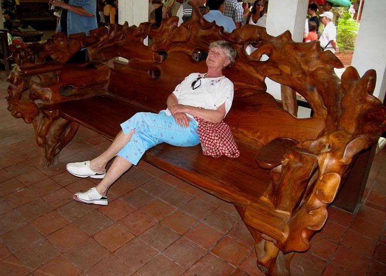 Моя супруга присела отдохнуть на огромной скамейке, вырезанной из тика этими мастерами: