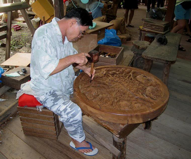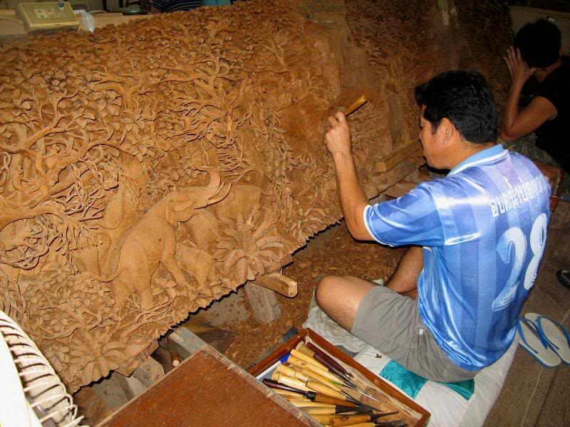 Резчики по дереву мастерят стол и настенный барельеф из тикового дерева:
