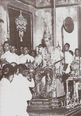 Bhumibol Adulyadej (таиландцы произносят: Пумипон Адунлаядет, "Сила Земли, Несравненная Власть") является девятым королём династии Чакри. Он был коронован на трон 5 мая 1950 года. Этот момент запечатлён на фотографии внизу. Король произносит тронную присягу "Мы будем править справедливо, во имя успеха и счастья сиамского народа", при этом он выливает воду из поданной ему чаши, что должно символизироват
