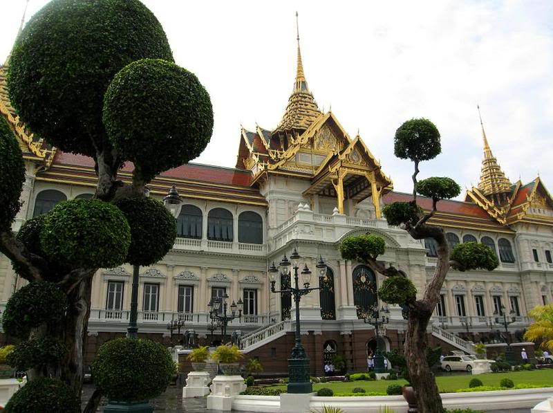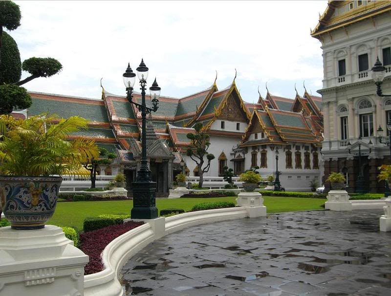 Нужно сказать, что королевская семья уже не живёт в этом дворце. Они переехали в другой дворец, в северной части Бангкока, а сюда наезжают лишь для того, чтобы нарядить Изумрудного Будду, и вот по случаю необходимости оказания траурных почестей родственнице. Мы с Тоней едили к тому дворцу, но там нечего смотреть или фотографироват