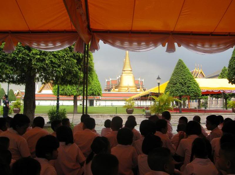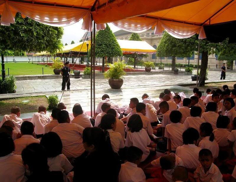 Мы трое тоже пристроились за детьми и стали ждать (наша переводчица не замолкала, честно отрабатывая свои пятьсот бат, и я подумал, что слишком много английского – тоже не сладко). К тому же ещё пошёл дождь. А Король всё никак не приезжал, что отнюдь не умаляло энтузиазма толпы.