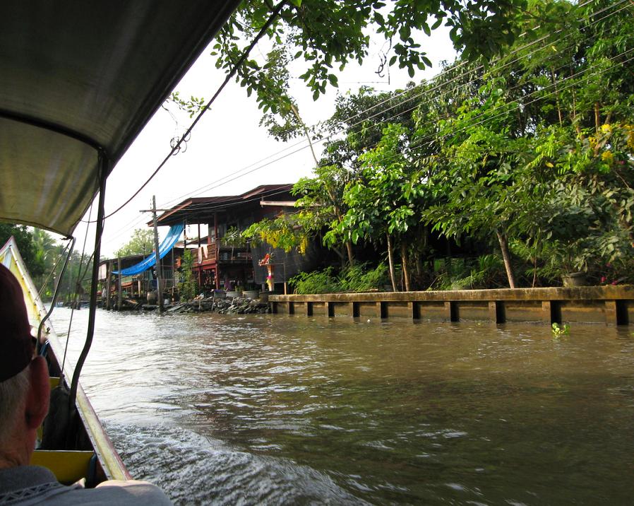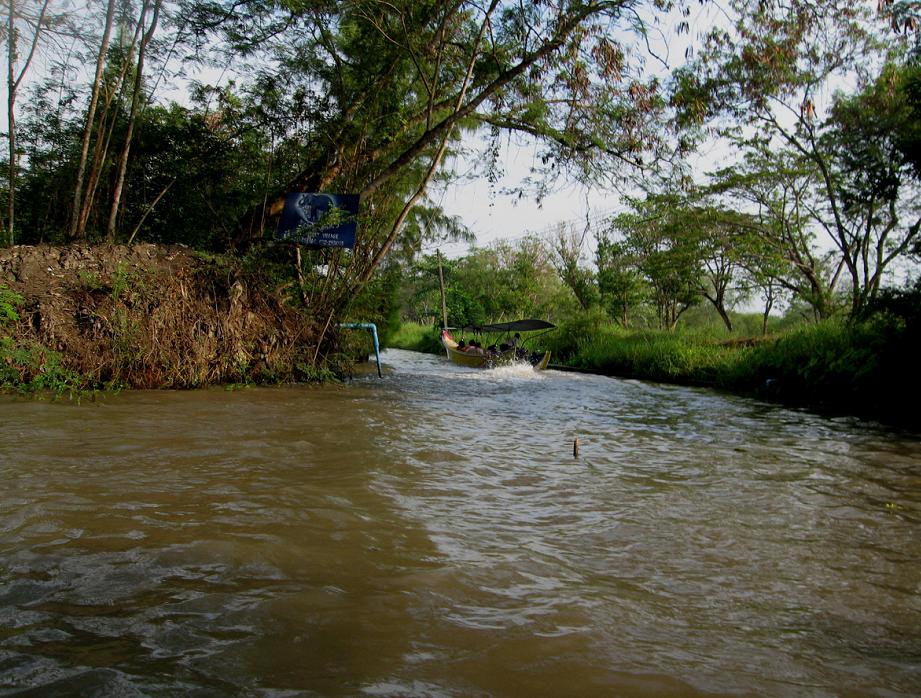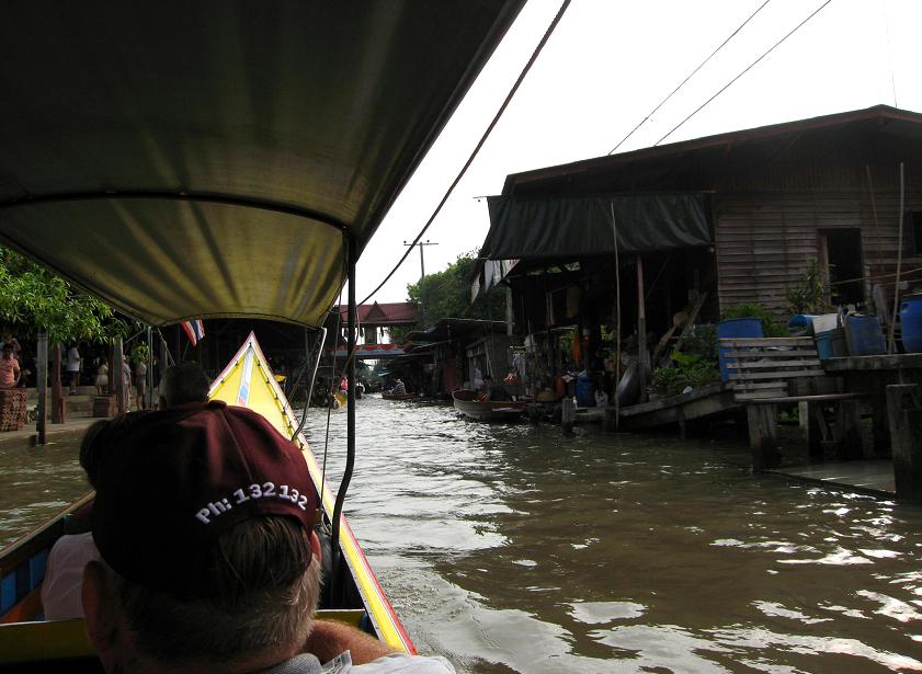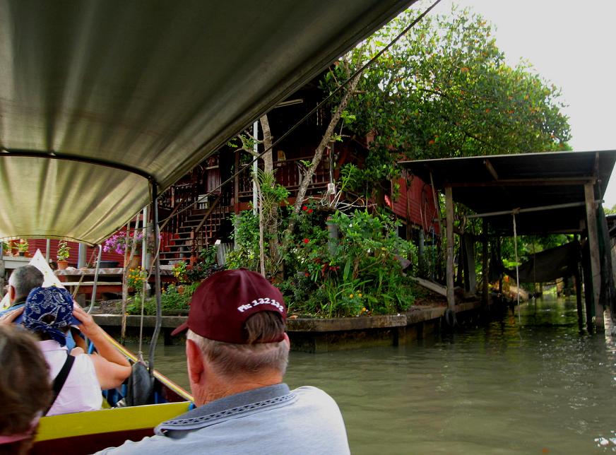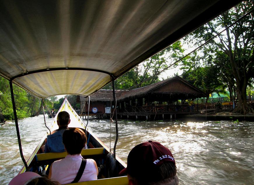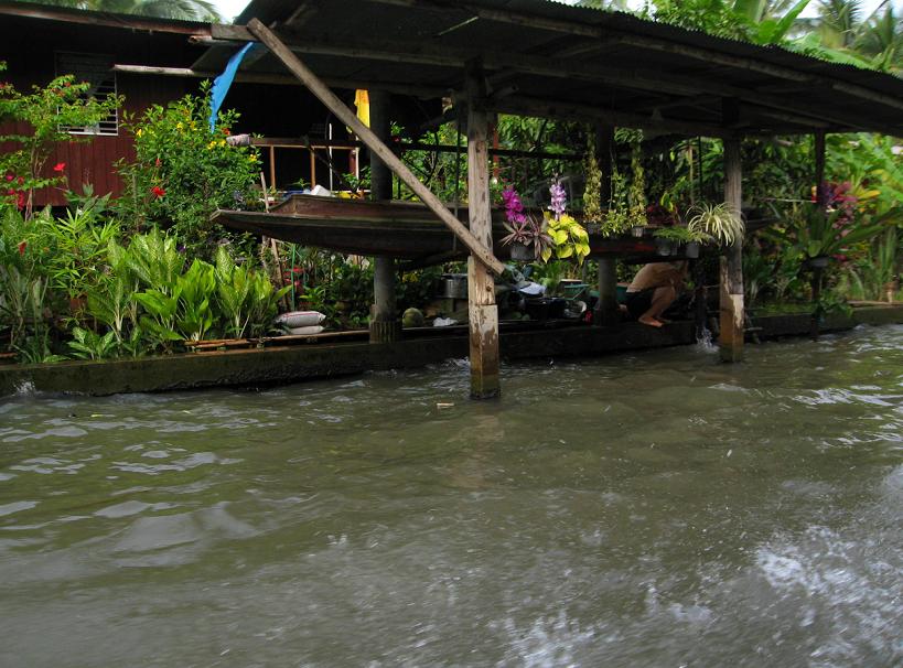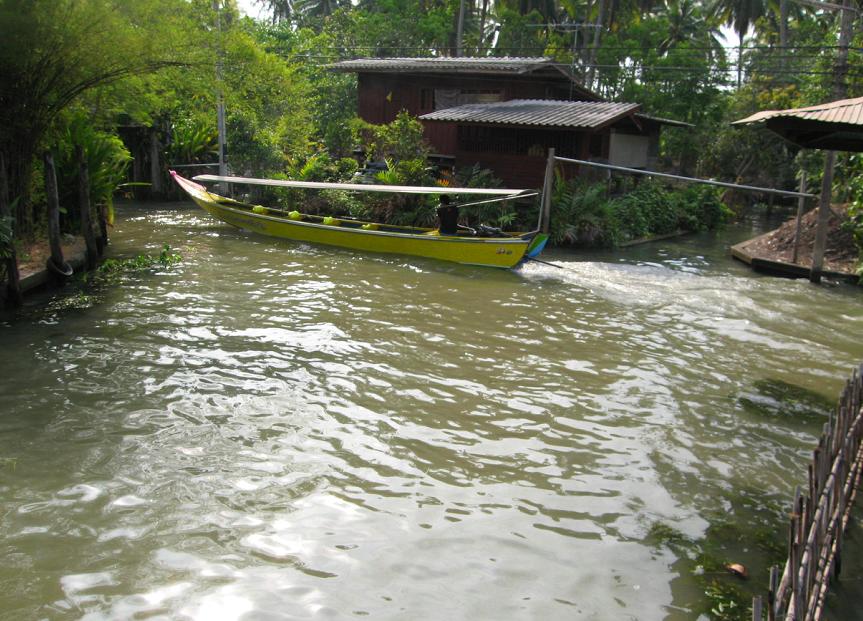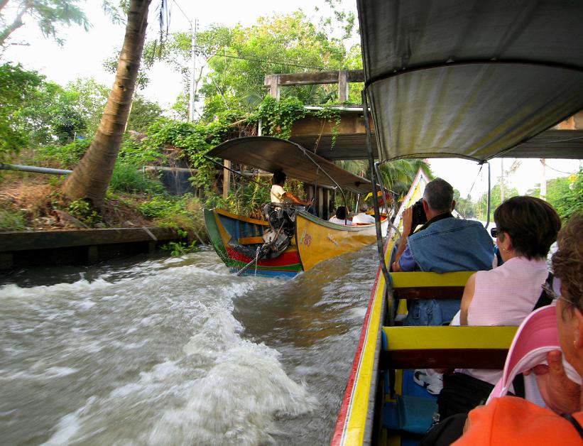 Мы вышли из автомобиля на берегу канала и пересели в одну из курсирующих по каналам speed boats. Эти лодки отличаются от тех, которыми мы пользовались в Бангкоке. Каждая из местных speed-boats приспособлена для шести пассажиров, которые сидят прямо на полу лодки: передние двое сидят один за другим, за ними сидит пара, и за ней ещё одна пара. Позади всех – кормчий-лихач, главной целью которого является как можно сильнее впечатлить своих пассажиров скоростью, в то же время не уступая другим лодкам возможности перегнать его лодку. Мы уселись сзади, чтоб не так сильно трясло на волне и можно было фотографироват ь.