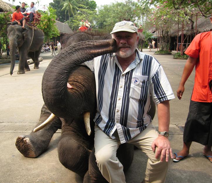 В конце концов эти красоты нам наскучили, Тоня потянула меня обратно на слоновью площадку и стала убеждать, что я должен "для неё" сфотографирова ться с молодой слонихой, которая позволяет сидеть у себя на колене. Не подозревая подвоха, я согласился (коварная супруга заранее подсмотрела, во что выливаются заигрывания с молодыми слонихами).