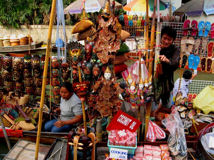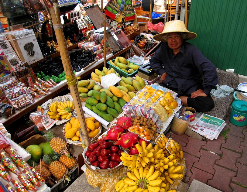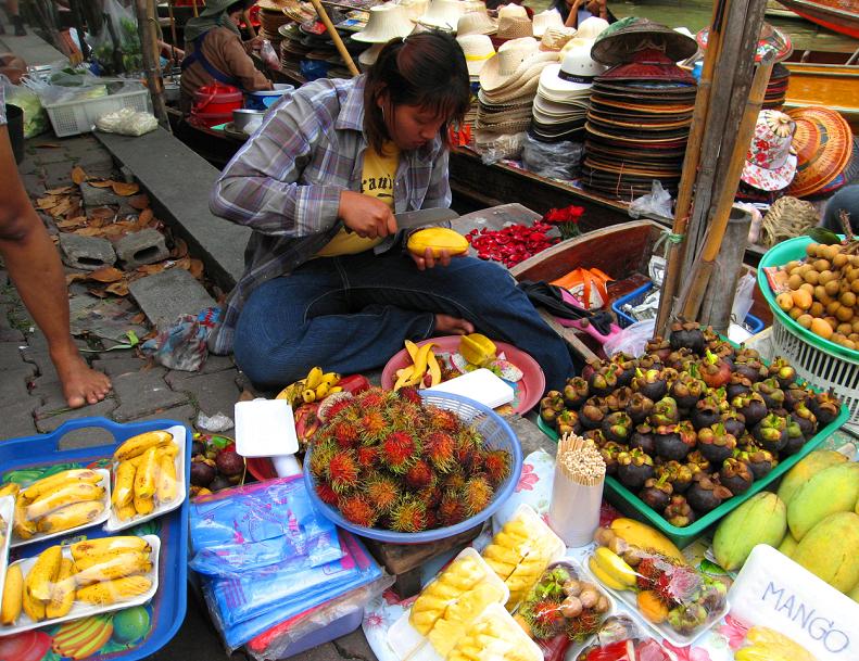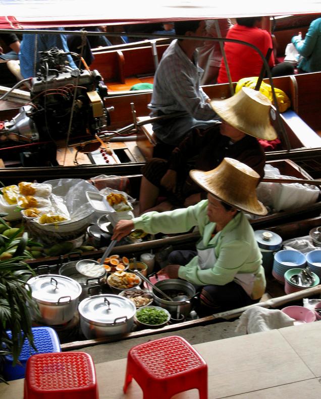 ...но чем дальше, тем больше становится торговцев, а также прибывших за покупками на лодках местных жителей – настоящий, крутой, галдящий рынок, предлагающий покупателю кроме галантерейных товаров (сумочек, шляп, босоножек, культовых предметов и проч.) такое разнообразие еды, что пером не опишешь.