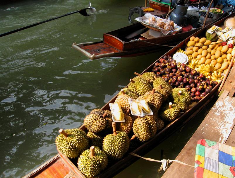 В числе прочих явств путнику предлагают плоды дуриана – cм. снимок внизу – здоровенные зелёные бомбы с колючками, каждая весом до пяти килограммов. Таиландцы считают дуриан королём местных фруктов. Полностью созревший фрукт – жёлтого цвета и, как утверждают местные жители, очень сладок. Если его вскрыть, внутри обнаружатся крупные жёлтые пласты слегка похрустывающей мякоти (они тоже видны на снимке). Есть, правда, одна небольшая проблема: я не советую вам не только вскрывать этот фрукт, но вообще прикасаться к нему. Дело в том, что дуриан издаёт невыносимо-тошнотворный запах гниющей плоти.